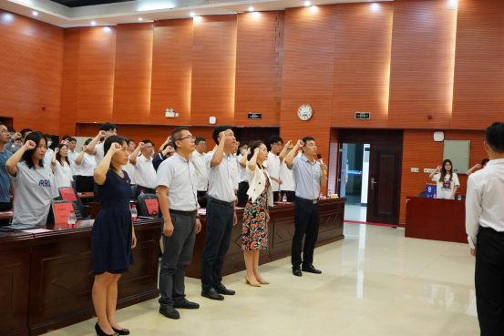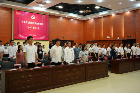大会在庄严的国歌声中拉开了序幕,全体党员在鲜红的党旗下重温入党誓词。计算机科学与技术学院党务负责人王红英通报了学院获得校级“两优一先”的表彰名单,并宣读了学院党委表彰文件,对beat365官网获奖的13名优秀共产党员、7名优秀党务工作者和3个先进党支部表示祝贺。