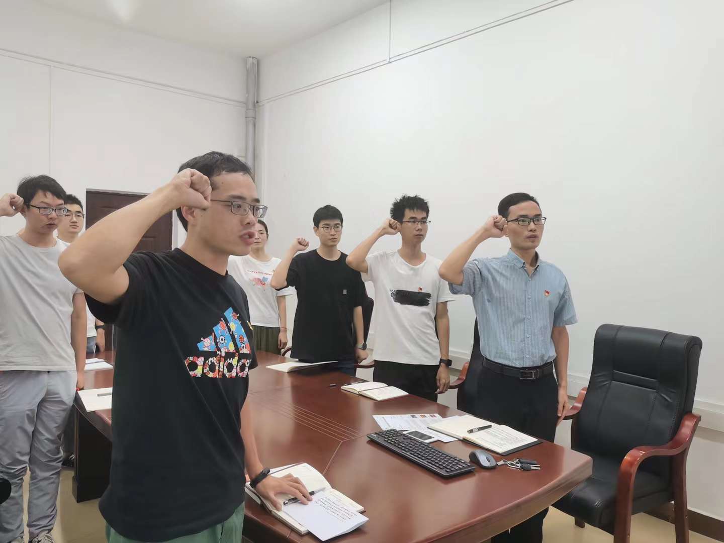 为进一步增强党员意识,宣传委员兼纪检委员曹凯带领大家重温入党誓词,所有人高举右拳,面对党旗庄严宣誓:“我志愿加入中国共产党,……,随时准备为党和人民牺牲一切,永不叛党。”铮铮誓言铿锵有力,拳拳初心矢志不移。重温入党誓词,使所有人的思想再一次得到洗礼,党性再一次得到锤炼。