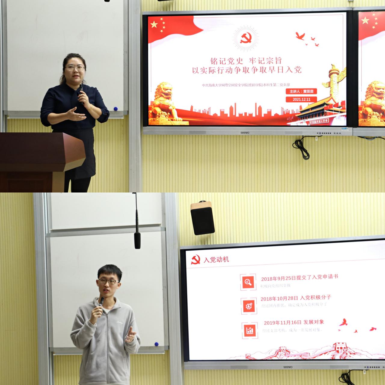 支部书记黄苗苗老师讲了题为《铭记党史、牢记宗旨,以实际行动争取早日入党》的党课。她希望,入党积极分子要认真学习党章、领会党章的深刻内涵;加强理想信念,加强政治理论学习;努力学习专业知识,提高综合素质;做到知行合一,积极参加实践活动;严于律己,在同学们中间树立标杆。希望同学们奋勇向前,争取早日入党。