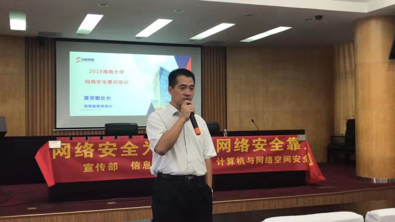 在本次网络空间安全宣讲活动中,我们有幸邀请到了海南省委网信办网络安全处处长黄坚敏、安恒信息技术股份有限公司主任陈宇乾、奇安信渠道技术总监田海燕等专家来beat365英国官方网站进行网络空间安全的知识讲座。