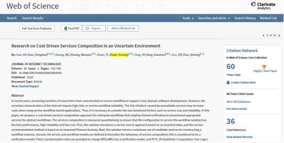 该论文于2019年11月在计算机、信息系统工程领域国际权威期刊WIRELESS NETWORKS(JCR二区)发表,据科睿唯安(Clarivate Analytics)公布的ESI高被引论文(Highly Cited Paper)数据,该论文至今累计被引49次,入选为由Web of Science识别的该学术领域前1%的高被引学术论文。该论文开展了针对物联网环境下多媒体的基于转化的DIKW(数据、信息、知识与智慧)类型资源处理研究。该成果对人工智能、物联网、信息融合以及智慧服务等相关领域研究具有显著推动作用。
