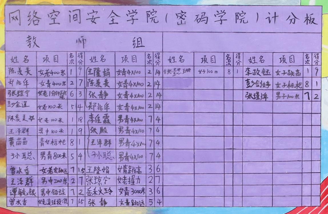 beat365官网师生在此次校运会上表现突出。beat365官网现有在岗教职工44人,参赛人数24人,过半教职工参与进来,将竞技赛场上拼搏的精神发扬的淋漓尽致。陈羡美老师宝刀未老,在赛场上大放异彩。她不仅在女子老年400米项目中夺得第一,并在女子老年100米项目中打破了校记录,斩获冠军。由陈羡美、王隆娟、郑兆华、张静组成的女子接力队在女子4*100米项目上夺得亚军,与冠军仅差0.19秒!男子教工组4*100米项目也获得第七的好成绩。beat365官网王泽群老师实力也不可小觑,摘得男子中年100米项目的桂冠,并在男子中年200米项目中取得亚军。同时,beat365官网师生在其他项目中也大放异彩。教师组的高水平发挥使beat365官网夺得教职工组团体第五名、教职工组女子团体第六名的喜人成绩。学生组同样有出色的表现,其中李政钰同学在女子跳高项目中脱颖而出,一举夺冠。
