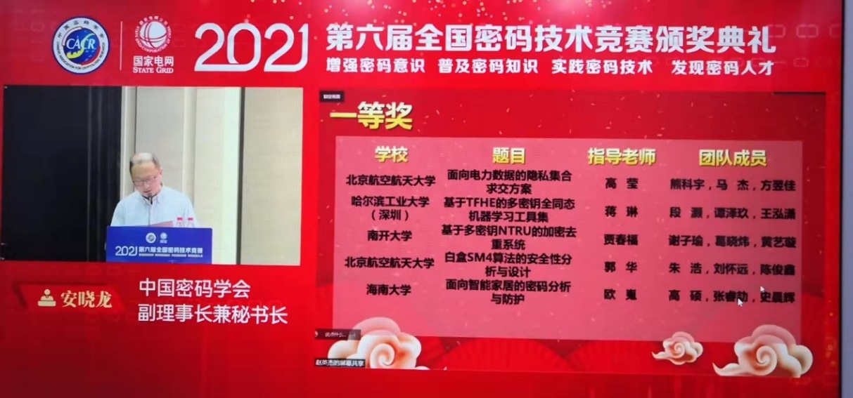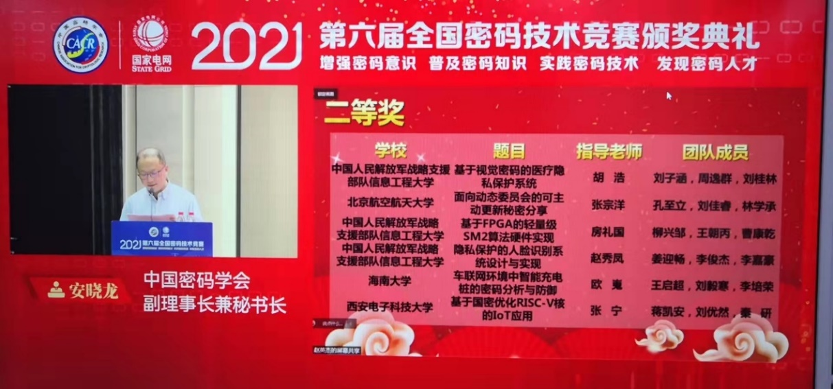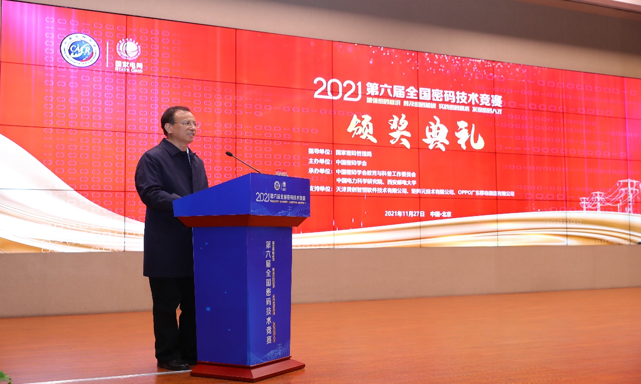 本次决赛评审和颁奖典礼采取线上线下相结合的形式,国家密码管理局正局级督察员于传斌、中国工程院院士蔡吉人、中国科学院院士王小云、国家电网有限公司互联网部副主任樊涛、中国电科院董事长(院长)赵鹏等现场参加了颁奖典礼。