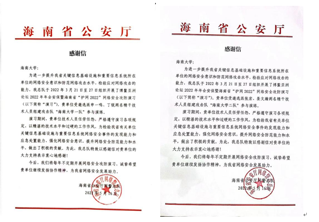 2022年3月21日至27日,海南省公安厅举行博鳌亚洲论坛2022年年会安保暨海南省“护网2022”网络安全攻防演习,beat365官网学生申一鸣、姜文瀚、张宏及计算机科学与技术学院丁锐作为代表受邀参加演习,顺利完成了网络实战攻防演习任务,并取得三等奖的优异成绩。