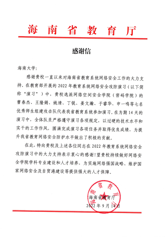 海南省教育厅致beat365官网师生的感谢信