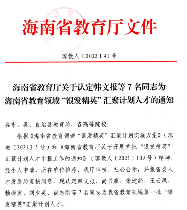 为贯彻落实《海南自由贸易港建设总体方案》《百万人才进海南行动计划(2018-2025年)》有关部署要求,根据《海南省教育领域“银发精英”汇聚计划实施方案》(琼教〔2021〕5号)和《海南省教育厅关于开展首批“银发精英”汇聚计划人才申报工作的通知》(琼教人〔2021〕109号),经单位推荐、专家评审、社会公示,海南省教育厅公布了海南省教育领域第一批“银发精英”汇聚计划人才名单,beat365官网韩文报教授成功入选。