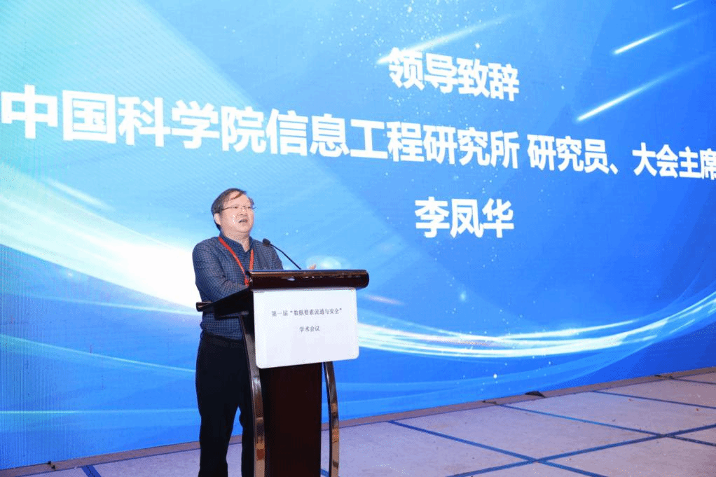 会议主席中国科学院信息工程研究所李凤华研究员致辞,他介绍了举办数据要素流通与安全学术会议定位、会议主题选择、程序委员会组成、如何开好本次会议等,希望本次会议在数据要素流通与安全方面提出前瞻性观点,研判未来技术发展趋势,并取得与普通学术会议不一样的效果。
